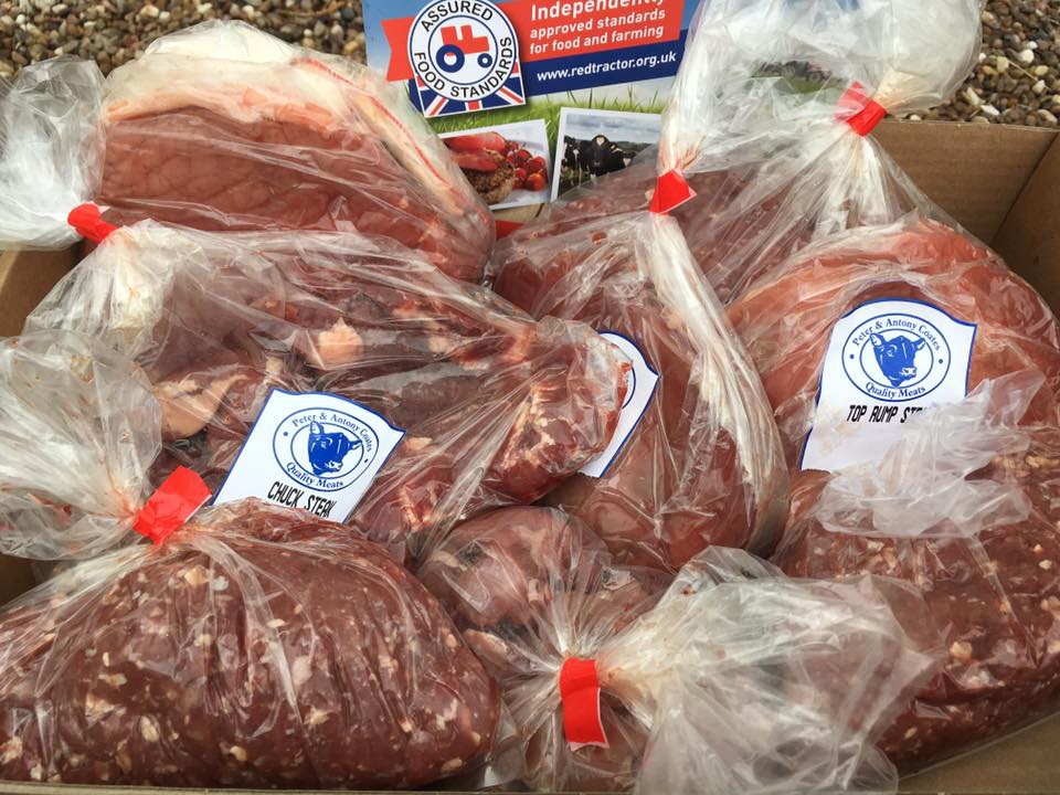 We sell 5kg selection boxes around three times a year, using the whole animal. Most of the beef is sold by pre order to a loyal group of local customers but we welcome anyone to join us at the farm on collection day to see what you might choose.